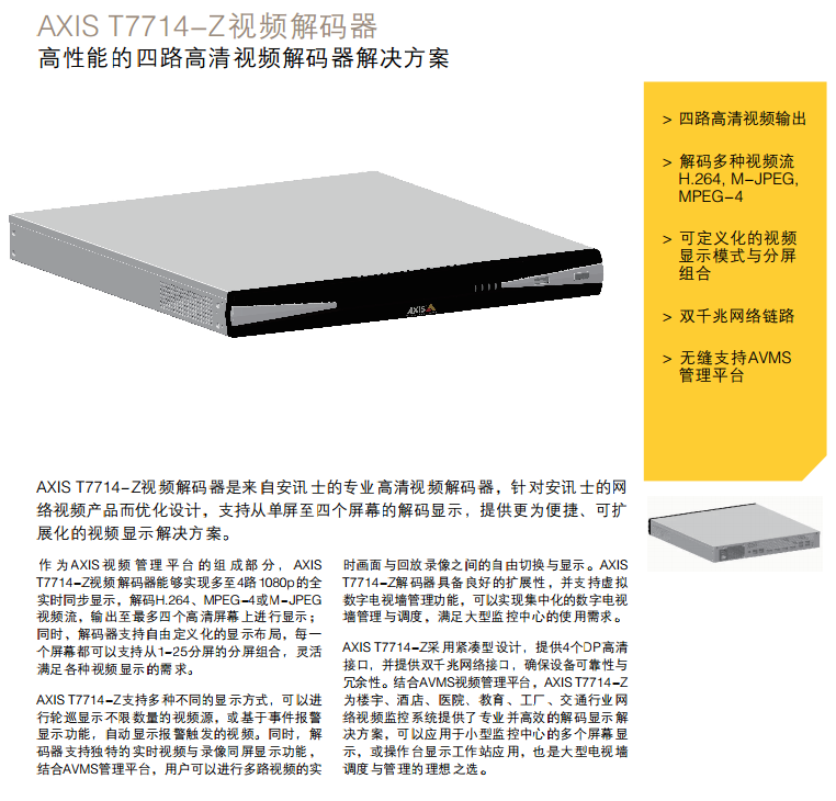 Product introduction:AXIS T7714-Z video decoder High-performance four-way high-definition video decoder solution