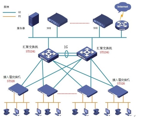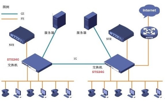 中小企業采用STS24G作為核心交換機,多臺之間可以通過智能識別技術實現設備性能和端口的同步擴展。在接入層采用STS26交換機,通過智能識別技術,實現包括NVR、IP Camera的設備識別及數據智能優化。