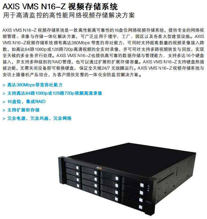 AXIS VMS N16-Z 視頻存儲系統 用于高清監控的高性能網絡視頻存儲解決方案 AXIS VMS N16-Z 視頻存儲系統是一款高性能高可靠性的16盤位網絡視頻存儲系統,提供專業的網絡視 頻管理、錄像與存儲一體化解決方案,可廣泛應用于樓宇、工廠、園區以及各類大型建筑設施。AXIS VMS N16-Z視頻存儲系統擁有高達380Mbps 帶寬的吞吐能力,可同時支持超高數量的視頻錄像接入路 數,如高達64路1080p或128路720p高清視頻的全實時錄像,并可同時支持多路視頻轉發與回放,實現 全天候的多業務并行處理。AXIS VMS N16-Z也提供高可靠的數據存儲與管理能力,支持多達16個硬盤 接入,并支持多種級別的RAID管理,也可以通過擴展柜擴展存儲容量。AXIS VMS N16-Z支持硬盤熱插 拔功能,無需關閉設備即可替換硬盤, 保證全天候24/7 無故障運行。AXIS VMS N16-Z 視頻存儲系統與 安訊士攝像機產品結合,為客戶提供完整的一體化安防監控解決方案。 > 高達380Mbps 380Mbps 380Mbps帶寬吞吐能力 > 支持高達64路1080p或128路720p視頻高清錄像 > 16盤位,集成RAID > 支持擴展柜存儲 > 冗余電源,冗余風扇,冗余網絡